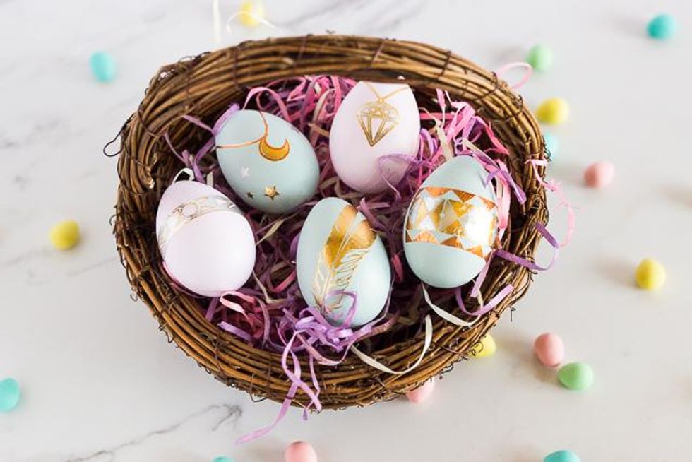 Once your eggs are dry, prepare your flash tattoos. Remove protective sheet from flash tattoos and place them with the design face down on your eggs.