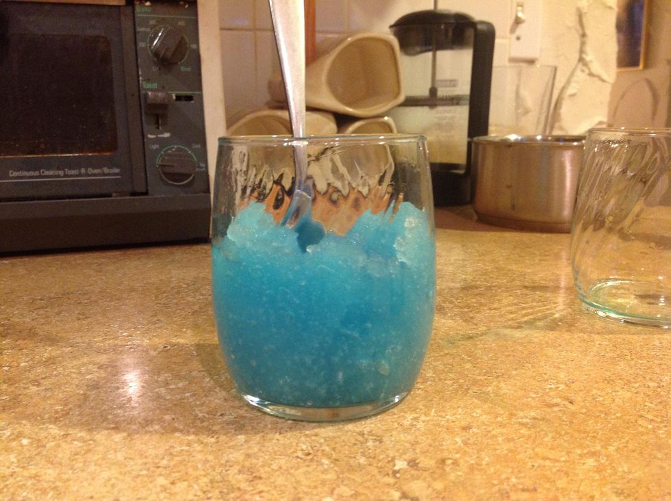 Gather one part sugar, two parts water, the color of food coloring that you want your ice to be, and a glass full of fresh (white) snow. Stick the snow in the refrigerator.