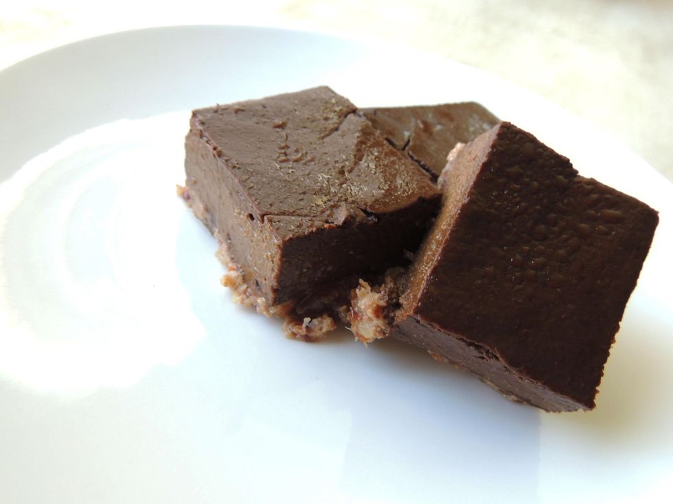 Soak the dates at least half an hour. Add them and the walnuts to food processor or blender. Should be a crumbly mix. Press this mixture into the bottom of a greased 8x8 pan. Pour the batter on top.