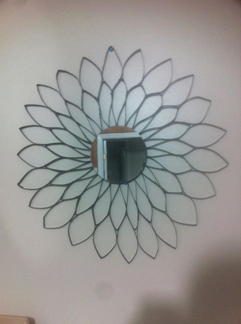 If you choose to stop here, spray paint it black or the color you choose, after it drys put some glue on the tops of the center then put the mirror on top and hang!