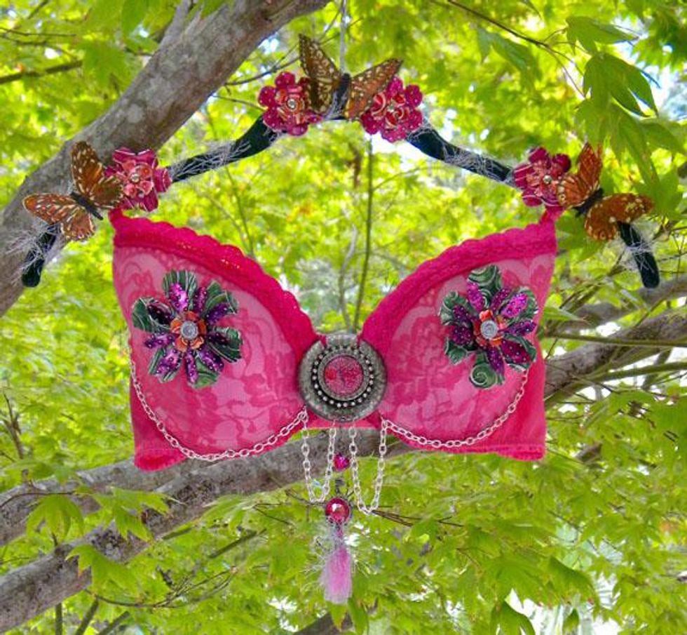 Layer the flowers and secure to the bra with a silver brad. I made a hole in the bra first with the piercer tool. Hand sew the pink lace, pendant and silver chain onto the bra.