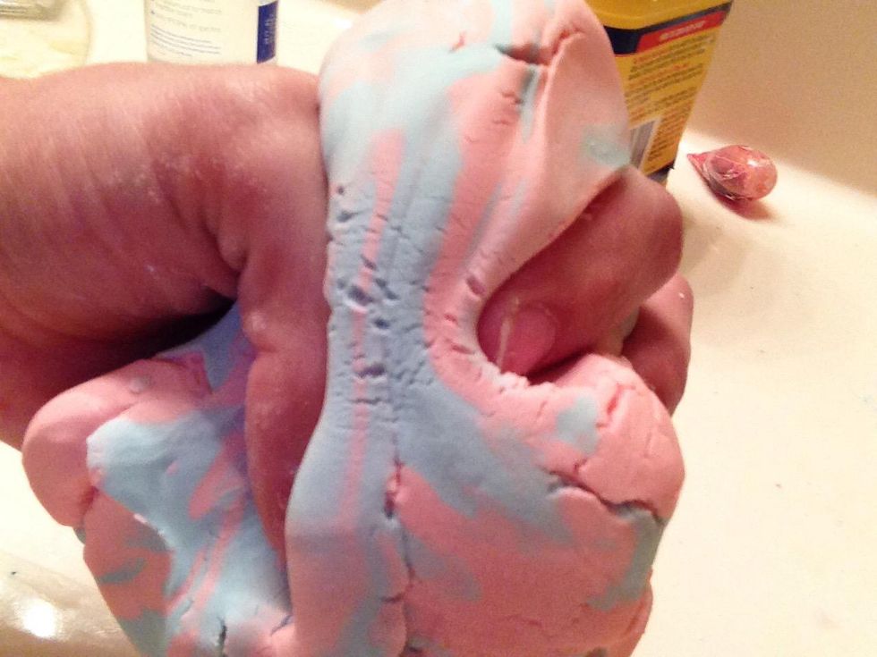 And mix it with your spoon until when you touch it, it doesn't stick to your finger. You can add more corn starch or shampoo to get the right consistency! Then start molding it with your hands.