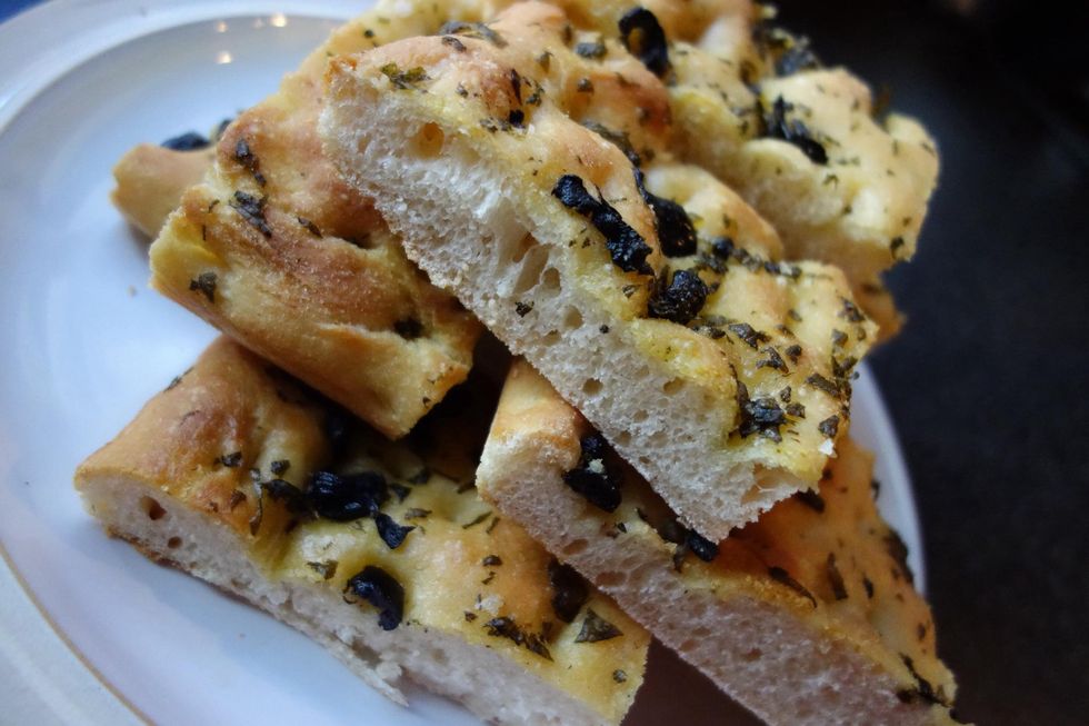 Using fingertips spread oil and toppings over the dough and push dimples into the bread. As you do this it'll fit the tray better. When done, sprinkle with salt and put aside to rise for an hour.