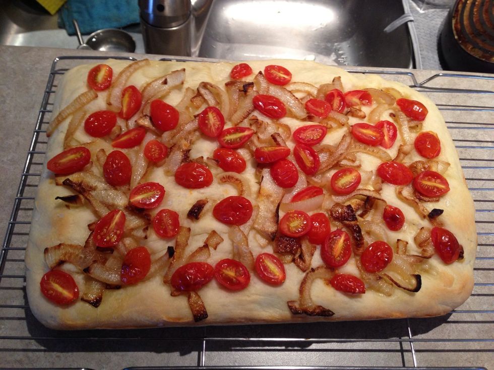 That dough looks ready. Using your fingertips make a whole bunch of dimples in the dough and drizzle some olive oil on top. It will pool nicely in the dimples.