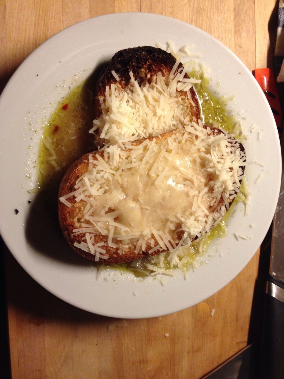 When the bread is done, put the Parmesan on the bread at put it back in the oven. When the cheese is done pour the soup in a bowl and place the cheese bread on top.