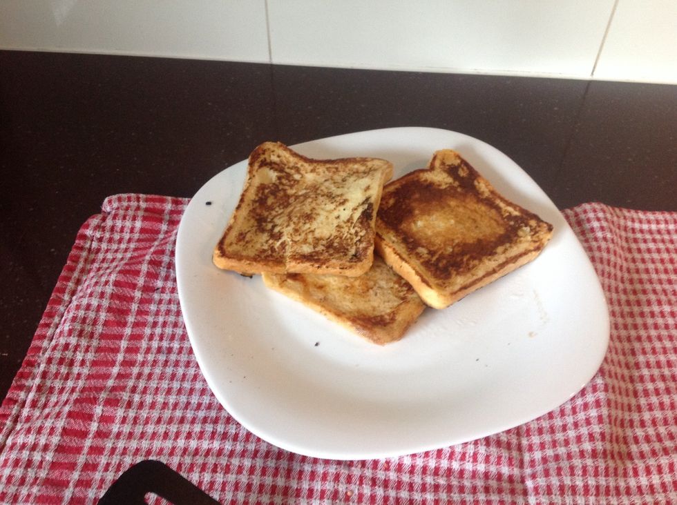 Once the pan is heat up, soak any type of bread in the mixture and fry. repeat this process another 2 times.