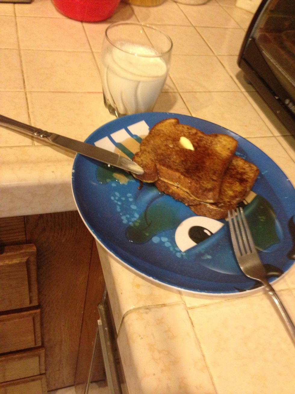 Put your ingredients into a bowl! Egg, add a splash of milk (as shown top right), splash of vanilla(bottom left), and cinnamon (bottom right)
