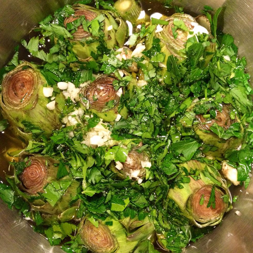 Pour olive oil on top of it all and bring the stock to a boil. As soon as it begins to boil turn the heat down and let it all simmer for 1+ hours. Ladle broth over the artichokes every so often.