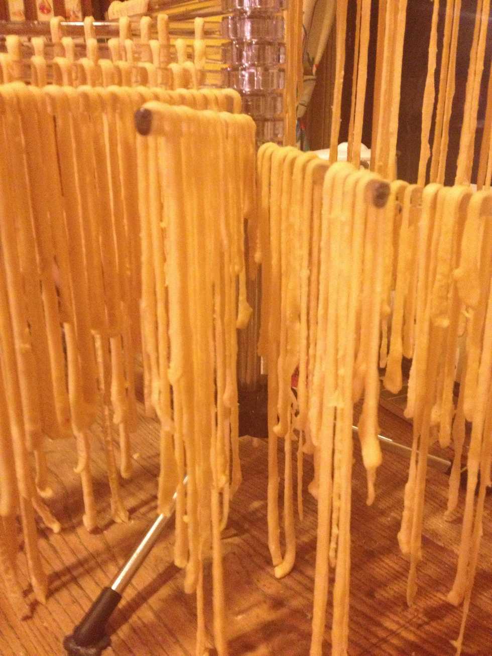 Place the dough between the rollers cutting (for those noodles ...). Attention to retrieve the pasta without breaking or sticking. Place the pasta on the dryer.