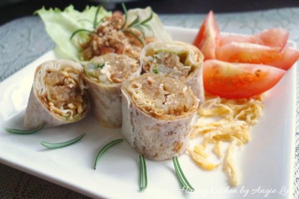 Lastly, wrap and then fold up the two sides of wrapper and roll up like a swiss roll. And we're done!