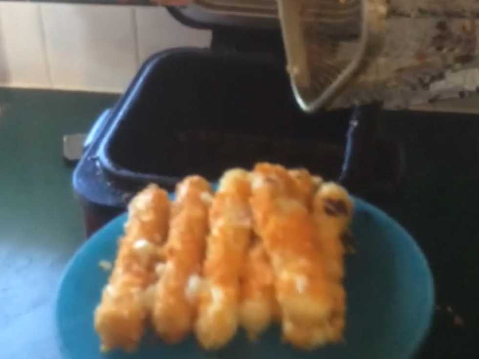 Plug in fryer and turn switch to turn it on. After 5-10 minutes the oil in the fryer should start to bubble, this means it is ready.Gather flour and bread crumbs from pantry and place them by the fryer