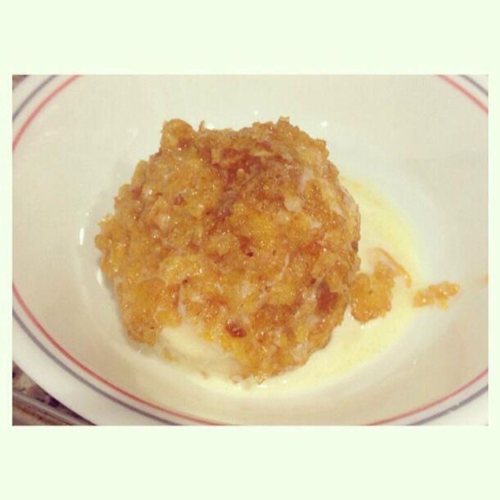 WARNING: since we are frying the ice cream and working with hot oil be EXTRA careful.Scoop ice cream out into balls and place it on a parchment paper. Place in the freezer for an hourPlace back in the freezer for 3 hours