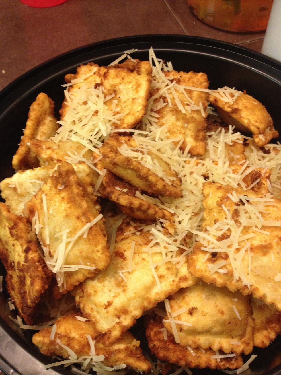 Once the ravioli is brown move to a brown paper bag ( or something to suck the oil up) and sprinkle with remaining cheese. ENJOY