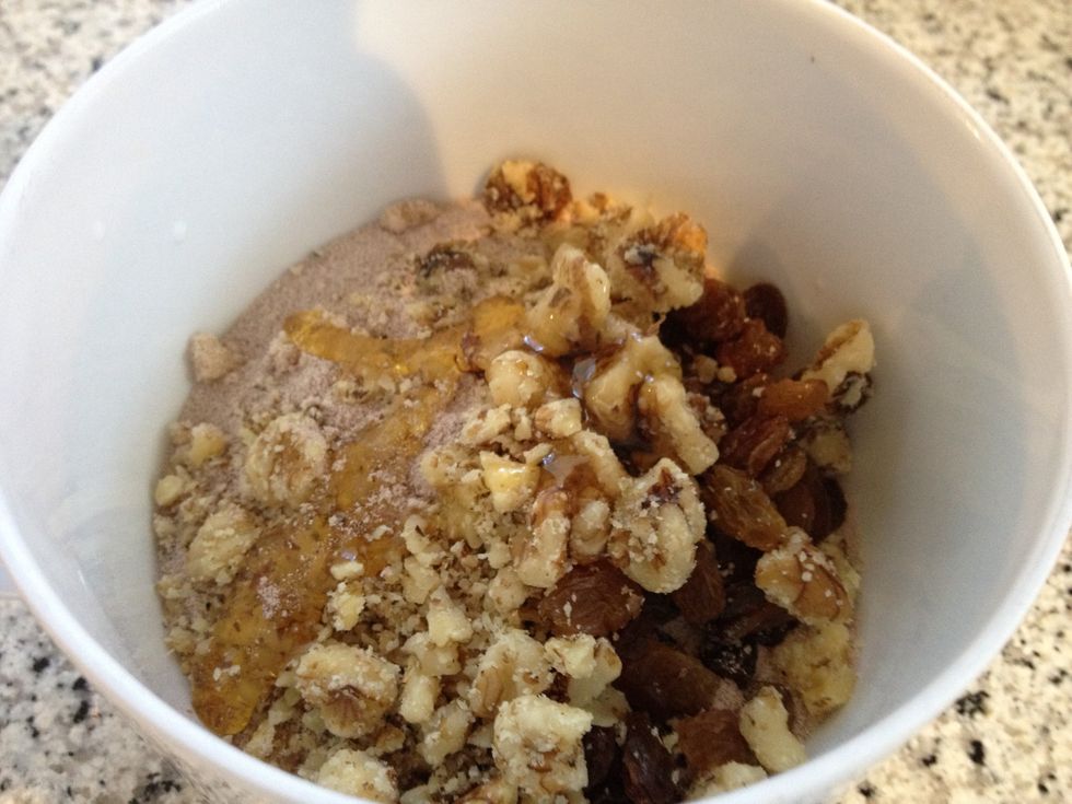 Mix all together in a bowl. I chose walnuts and threw in a tiny bit of honey for sweetness. *This honey counts towards your macros!