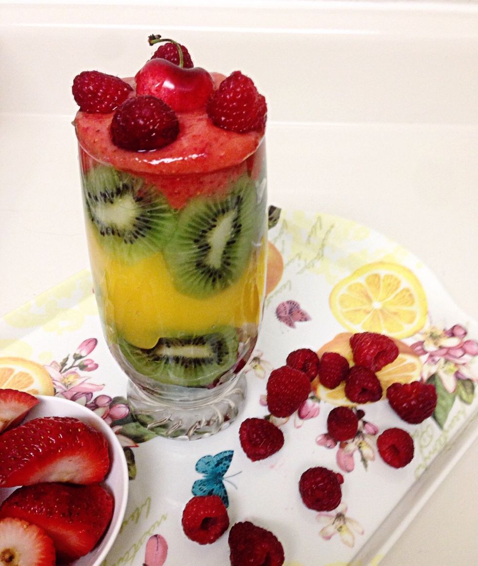 Here we have: 1 medium mango, 1 cup strawberries, 1 kiwi, 2 tbsp sugar (optional), 1 banana, and 1/2 cup raspberries