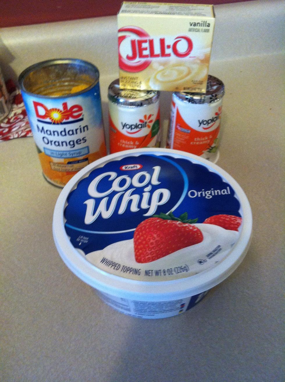 This is my first post so please bear with me. This shows all ingredients needed. Cool Whip Yogurt of your choice JELL-O Instant pudding Mandarin oranges