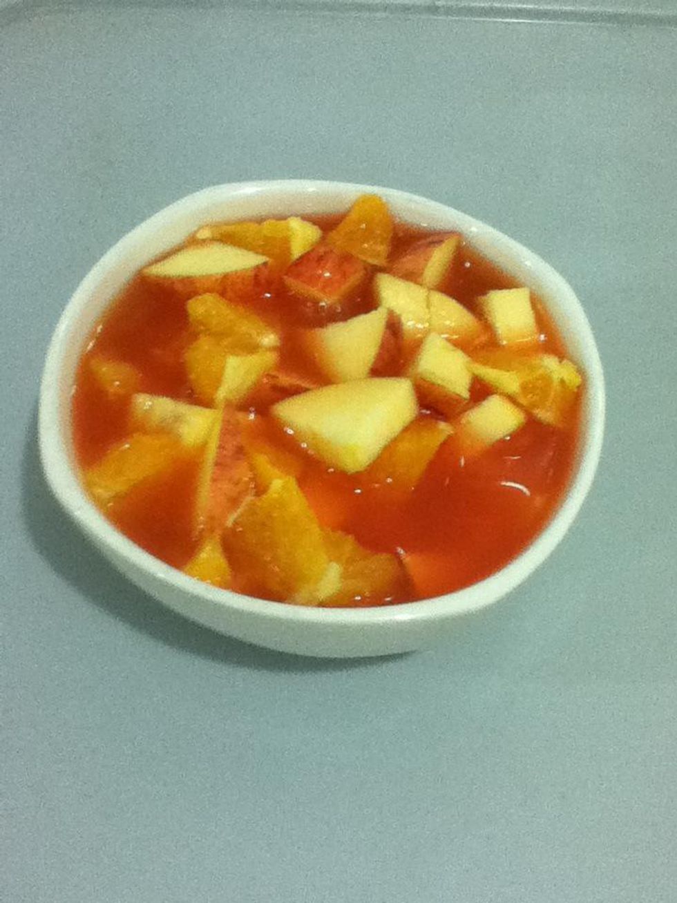 knifeone piece of orangeone piece of applefruit juicecut the apple into smallcut the oranges into smallmixing orange and applepour fruit juiceready to eat