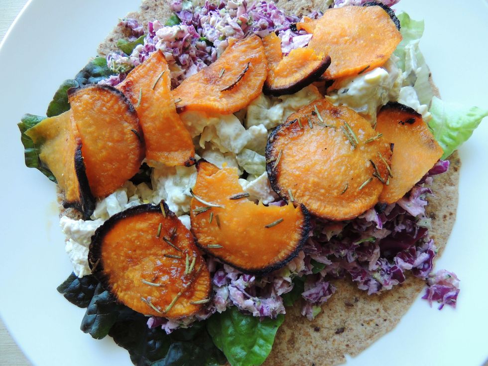 This slaw works great as a burger topping, in a wrap or as a side. Sample: ancient grain wrap, red leaf lettuce, chicken salad, topped sweet potato stacker (unstacked), slaw. Delicious!