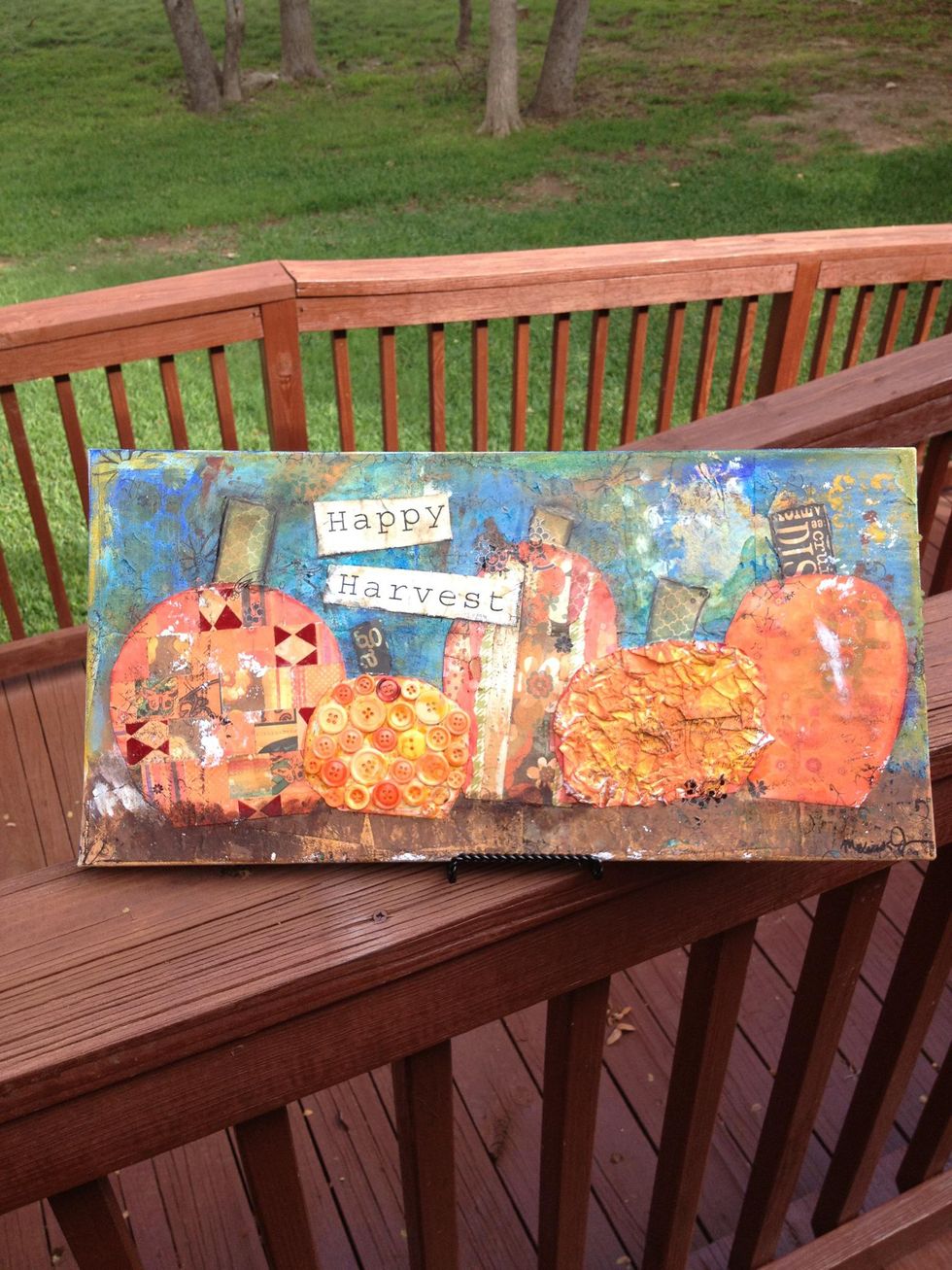 adhere all pumpkins to the canvas and use some green scraps of paper to create the stems. Attach those as well.