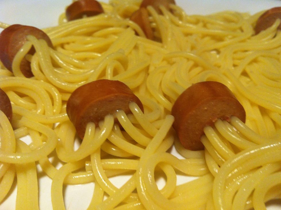 Boil until spaghetti is cooked. If you use different types of sausages the spaghetti gets that tasty flavor. Add your favorite sauce and enjoy a no mess spaghetti experience.