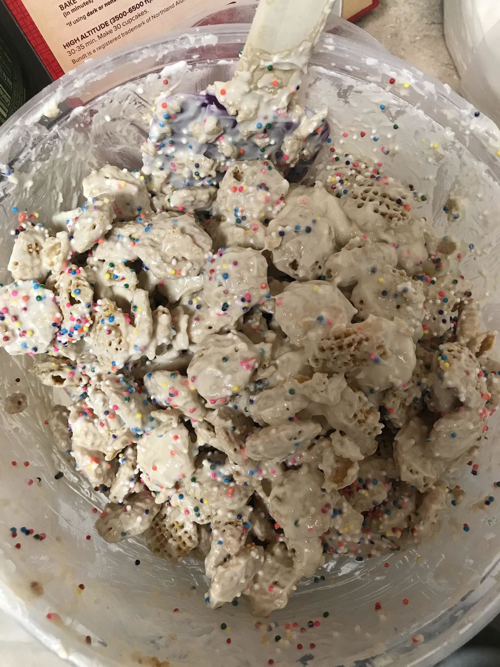 Pour Melted Almond Bark On Top of Rice Cereal and Fold To Cover All Cereal (Careful Not To Break Cereal) Add Sprinkles and Continue to Fold