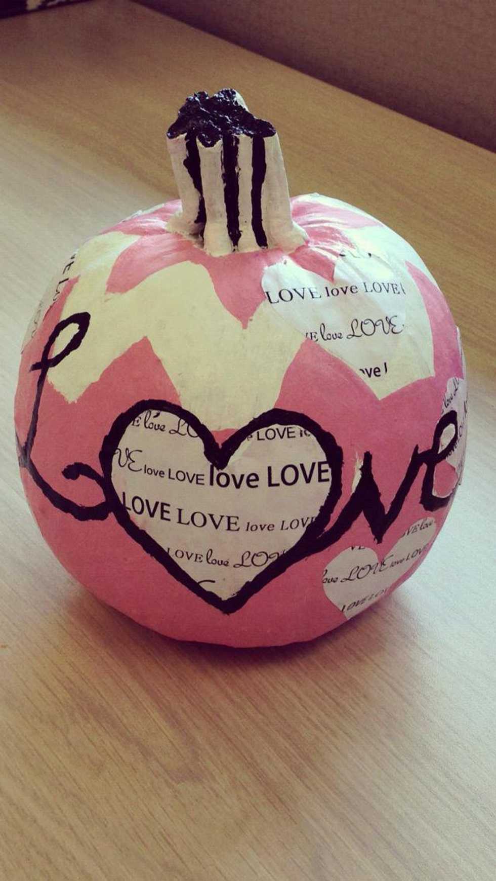 I printed hearts with the word love and used white glue to paste them on the pumpkin.