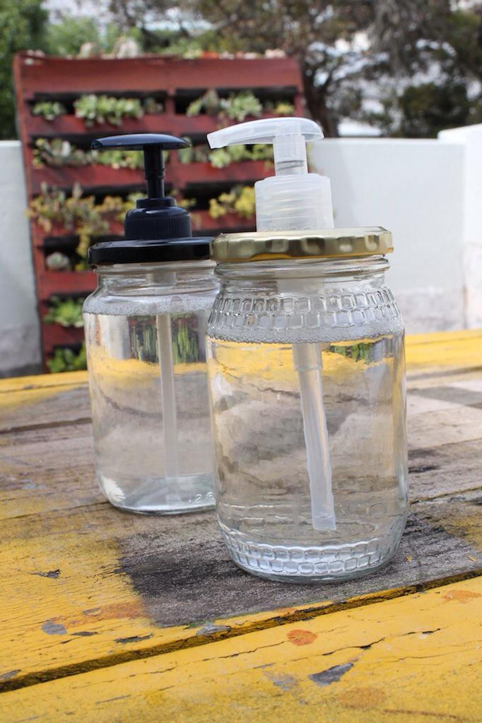 It’s easy to make glass jar soap dispensers. First save the jars you want to use and clean them thoroughly. Getting the labels off might be the most difficult part. We soaked ours in soapy water.