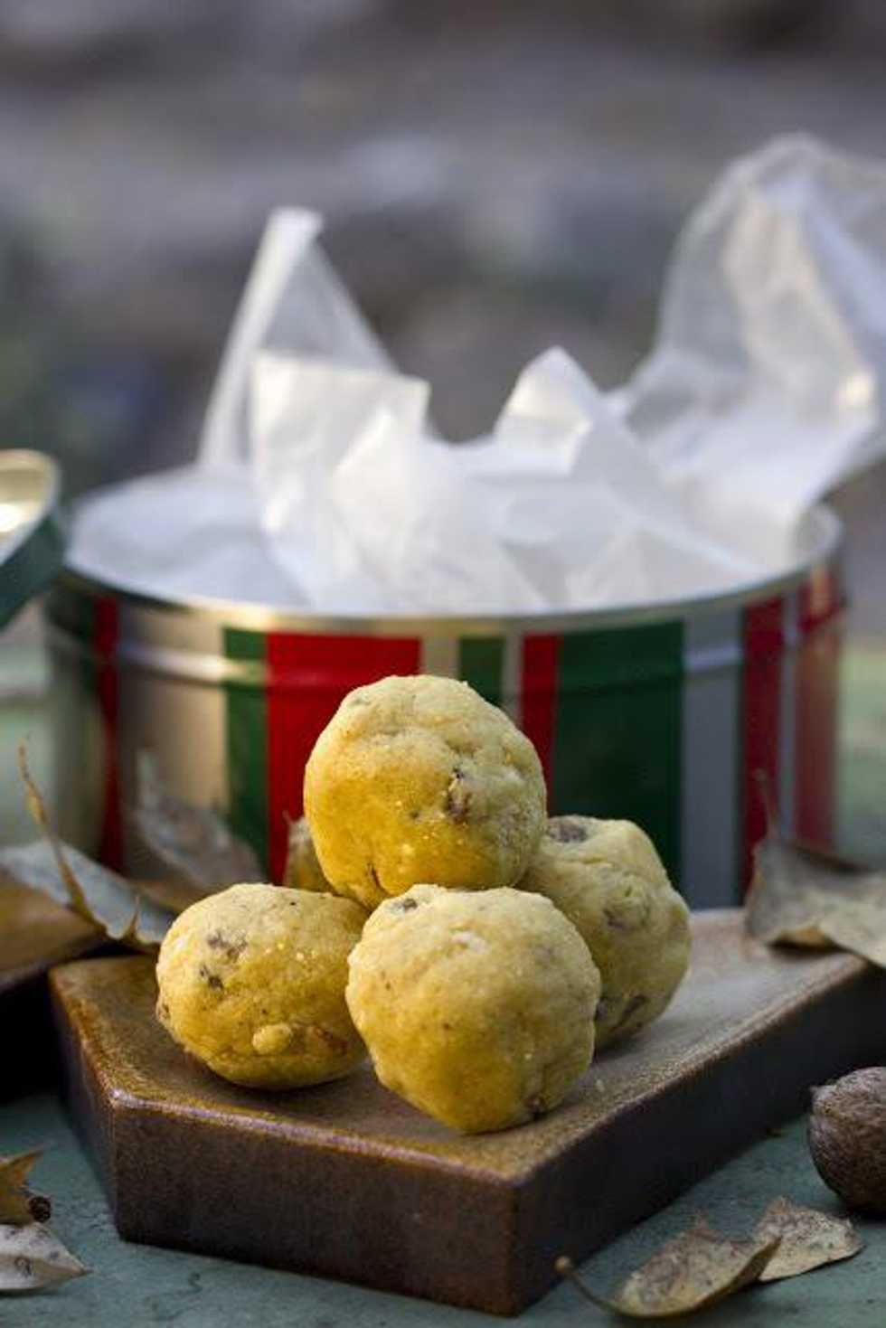 When the flour is nice and golden, take the pan from the fire and set it aside. When things have cooled a bit add in: 1 cup of powdered sugar 1/2 tsp of ground cardamom, fried cashews,and raisins.