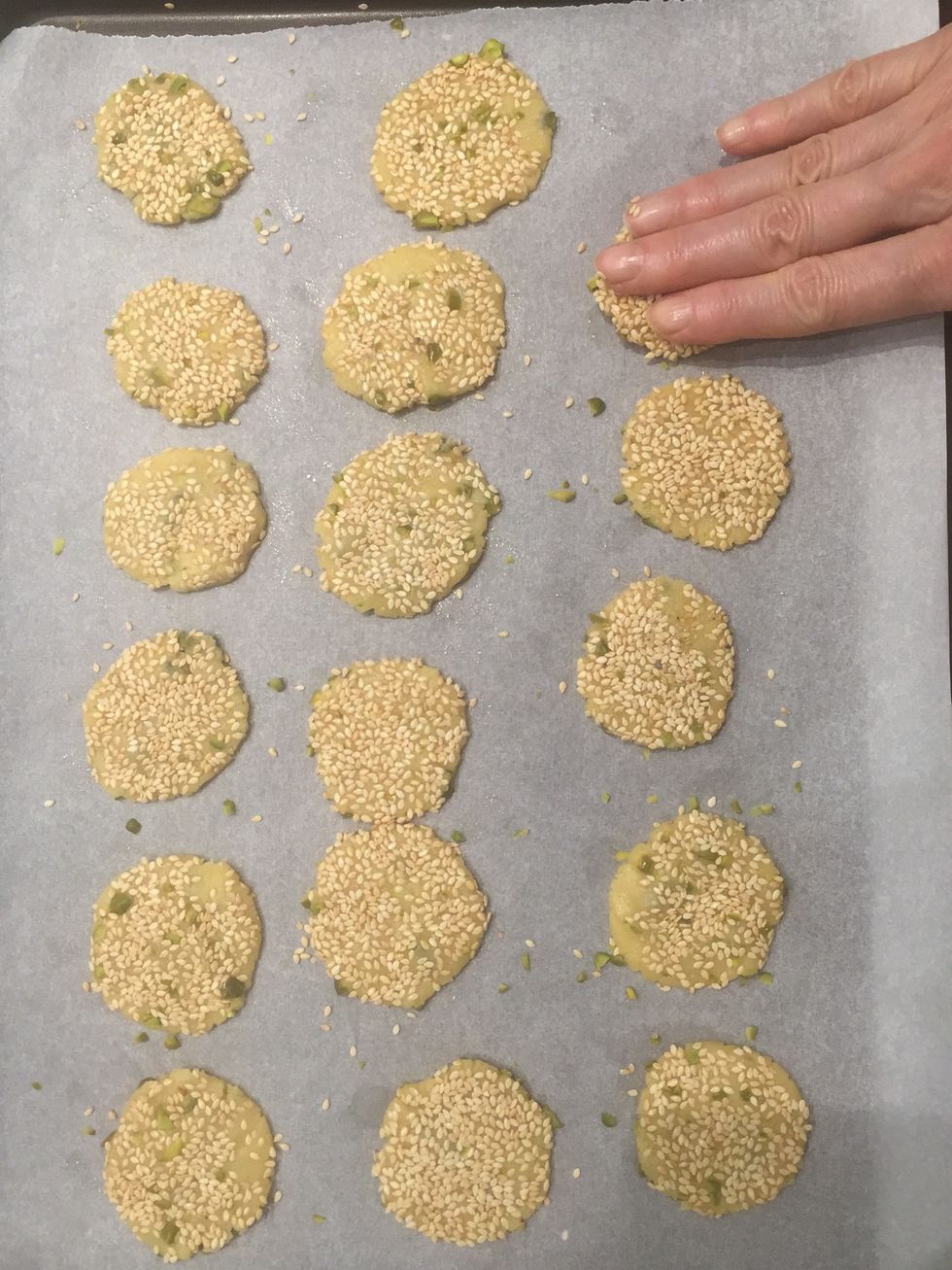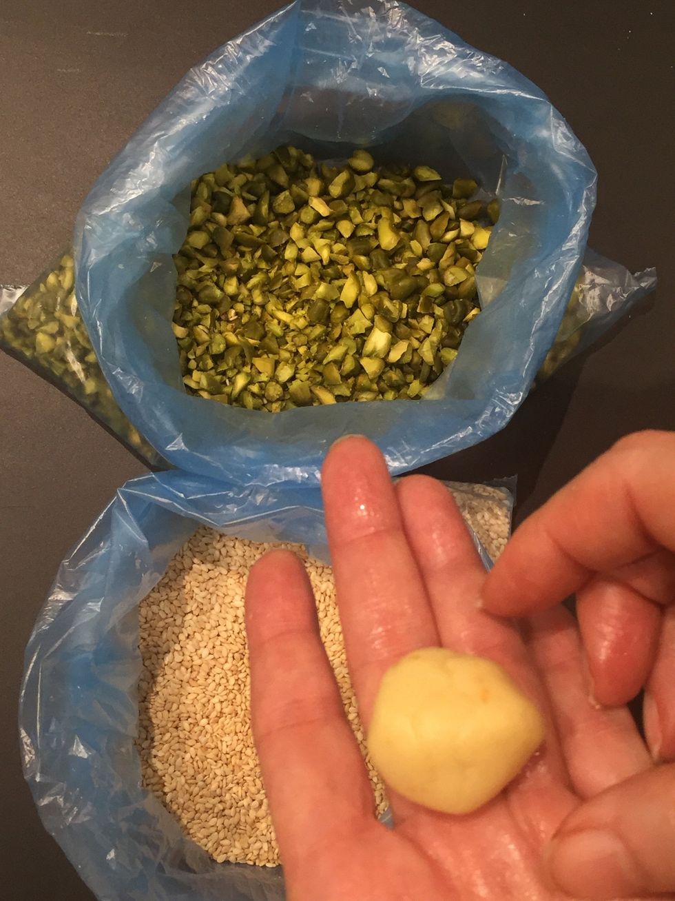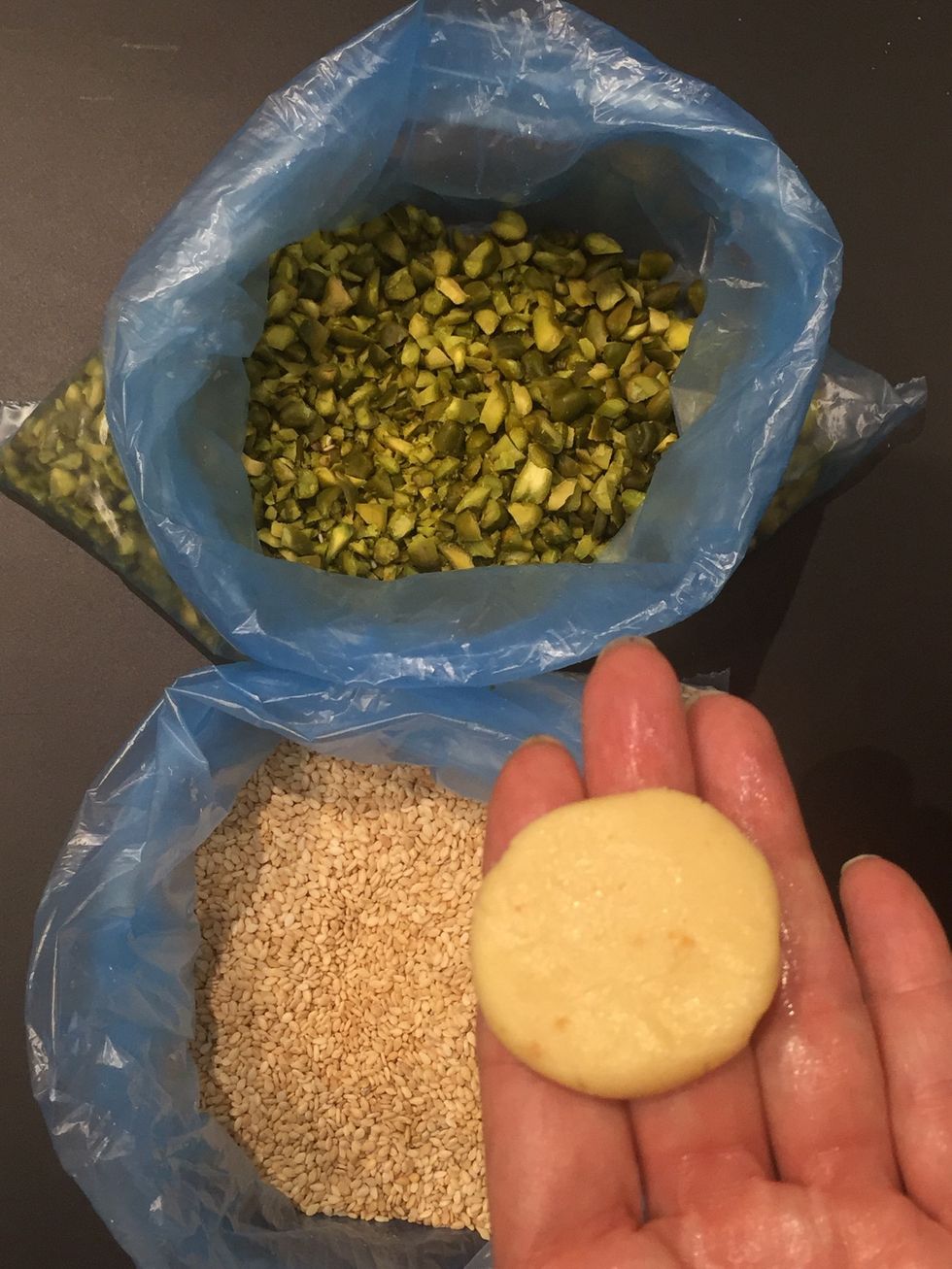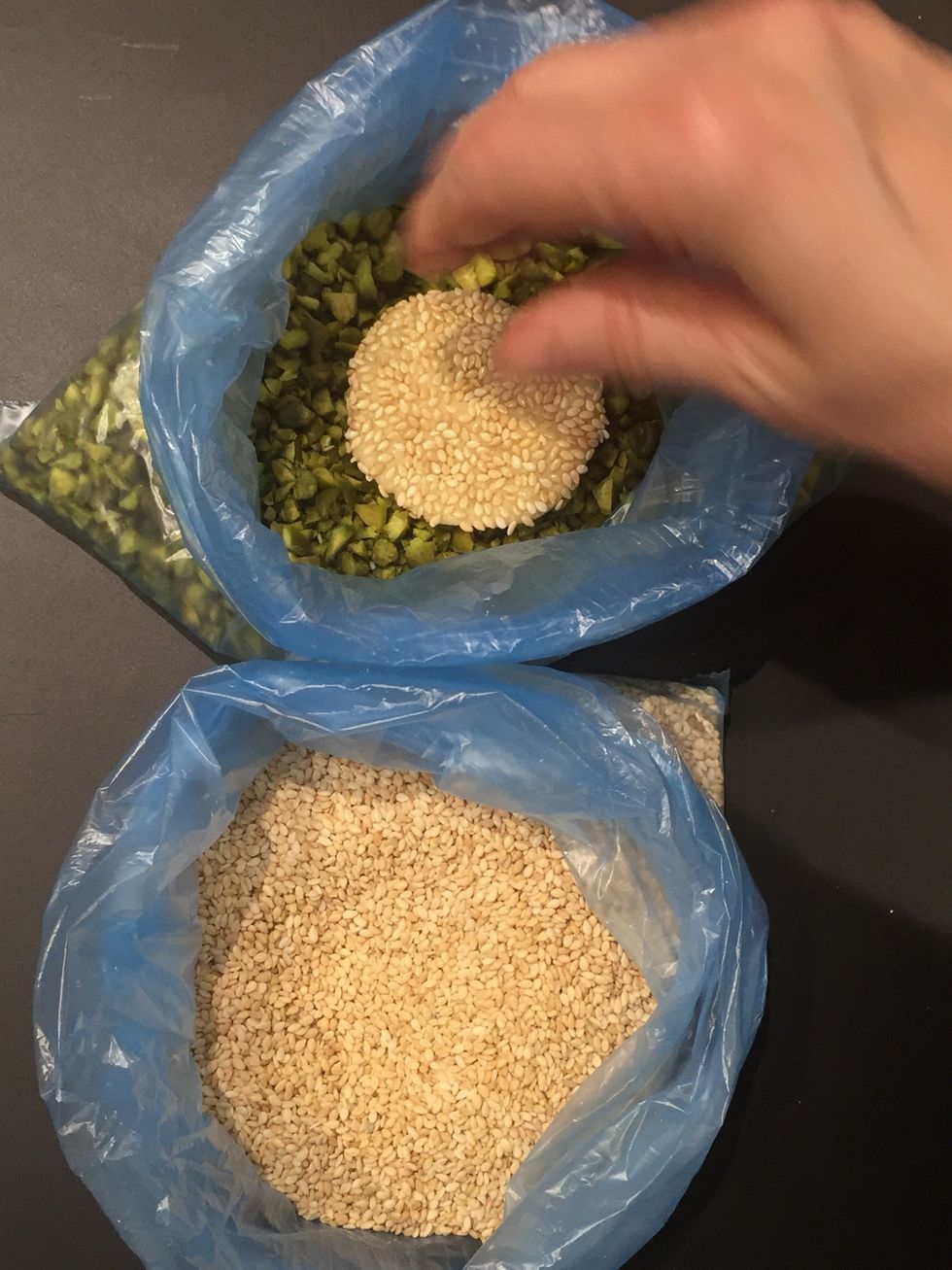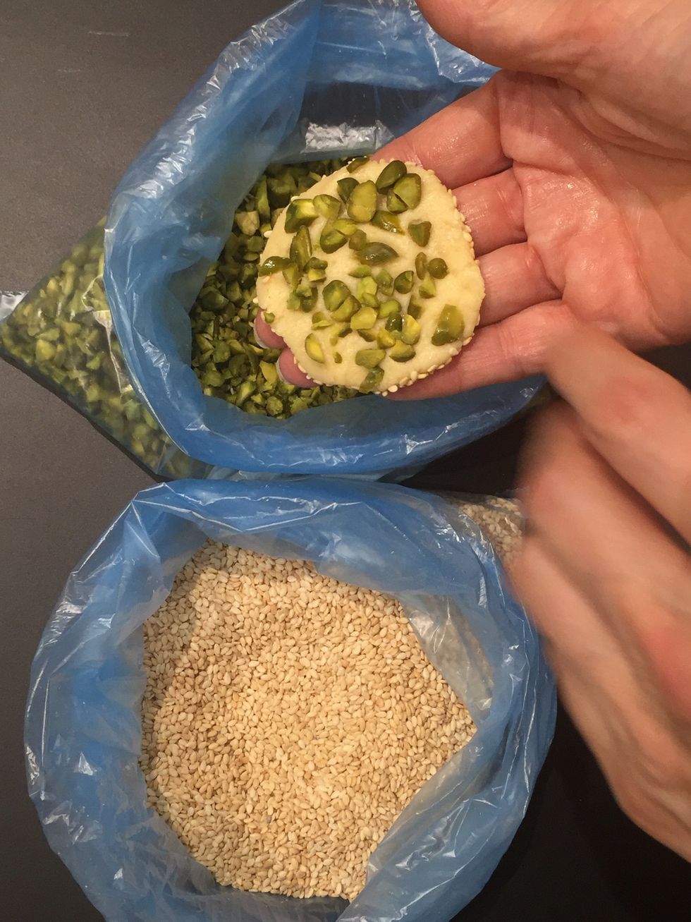 Cut into 1 cm discs. Either make a small ball or Dip the disc in the sesame with a little pressure then dip it in the chopped pistachios pressing slightly. Then put it on the tray press again