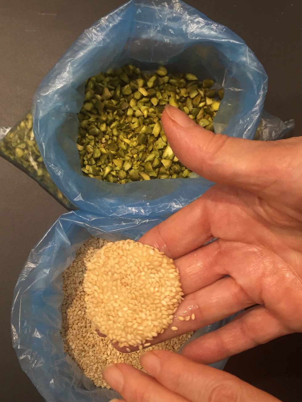 Grill..roast the sesame and chop the pistachios. Recommended to grill the sesame.