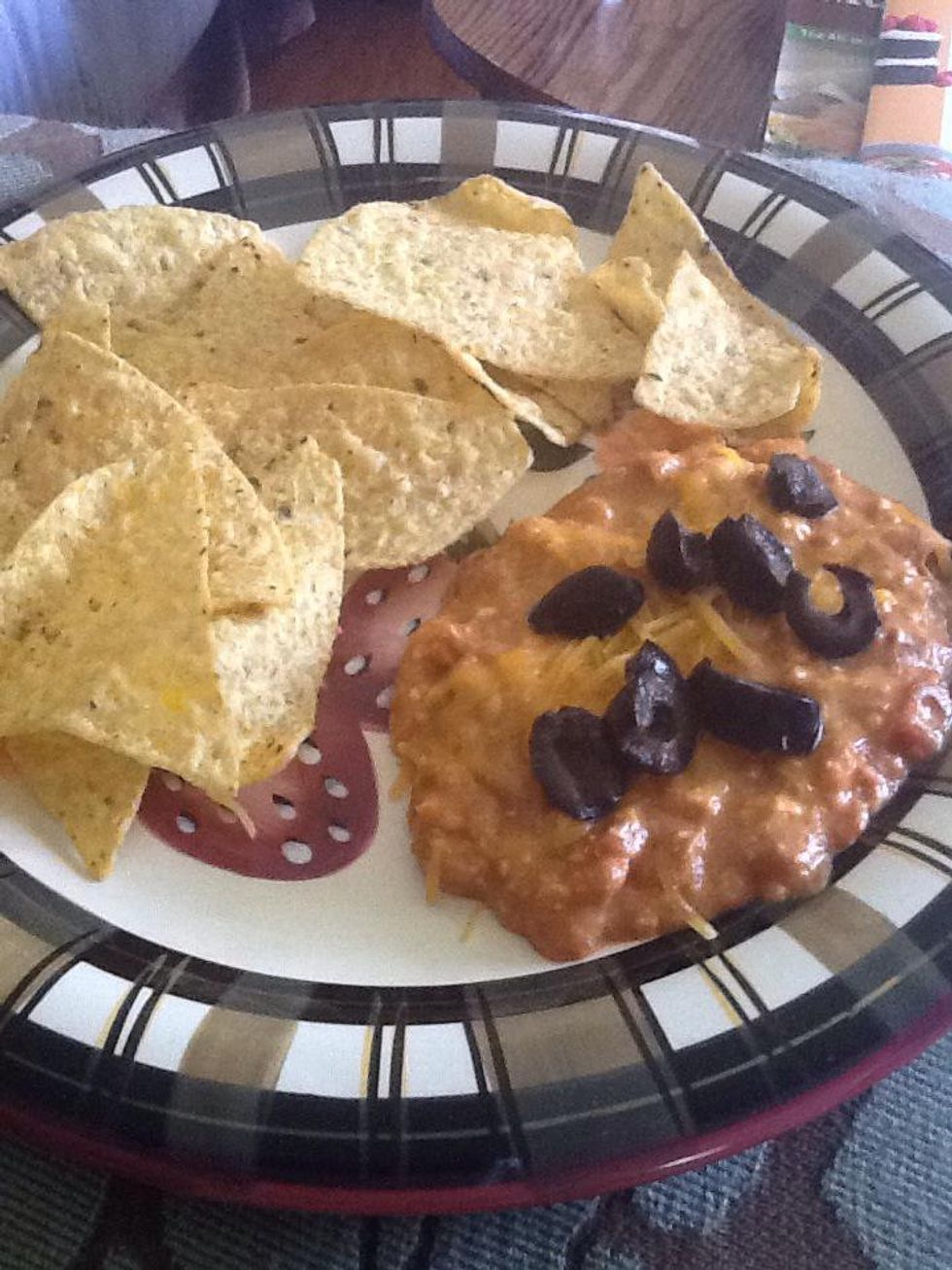 Top with cheese and black olives. Serve with gluten free tortilla chips. Enjoy!