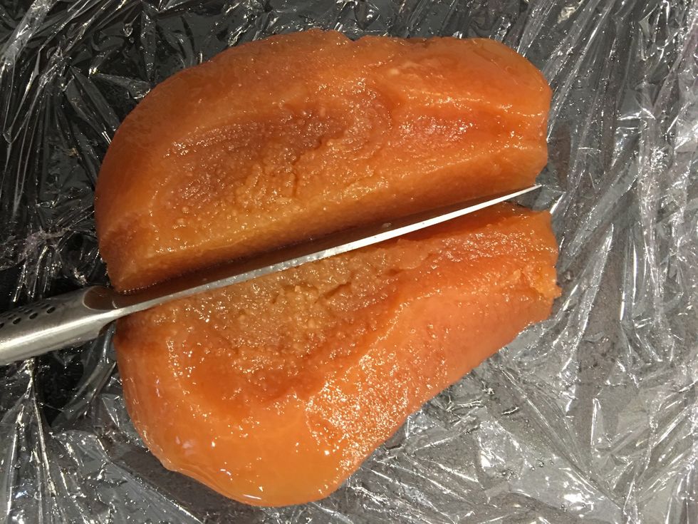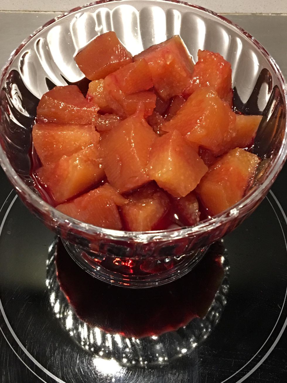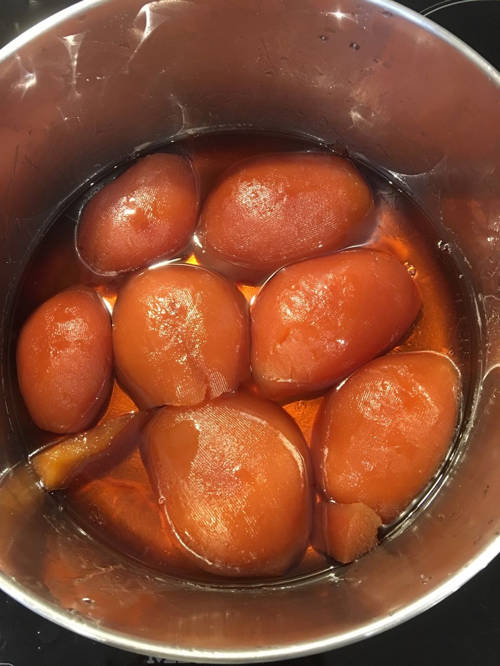Peel and core the fruits. Put the peel, the seeds and the fruit in the boiling syrup. Cook until tender (30mins). Then continue to cook on low untill the color becomes deep Amber.