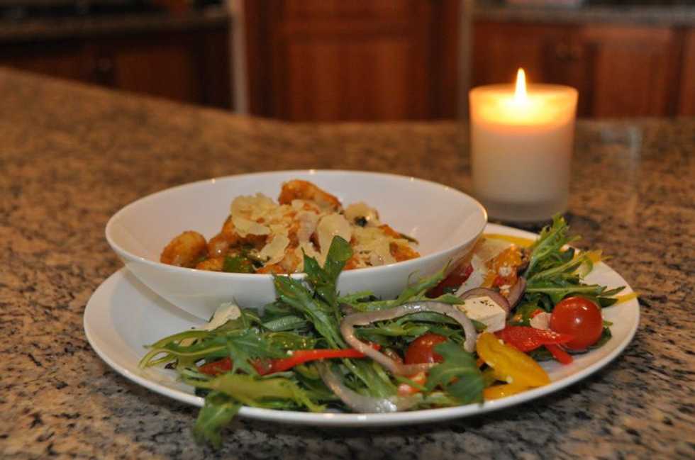 Step 4. Then lower the temperature to a simmer. Poor the gnocchi in the pot of water. And stir every 2 minutes until the gnocchi is soft. Then drain the water leaving the gnocchi in the pot.