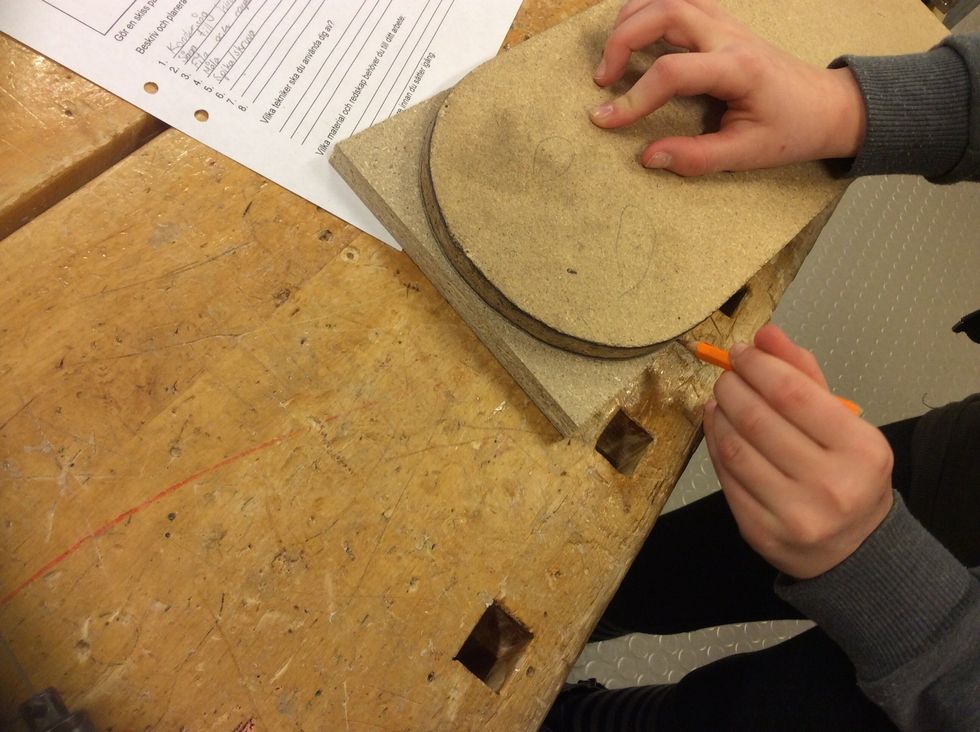 Borra med 22mm borr i pelarborrmaskinen. OBS prata med din lärare innan du börjar.