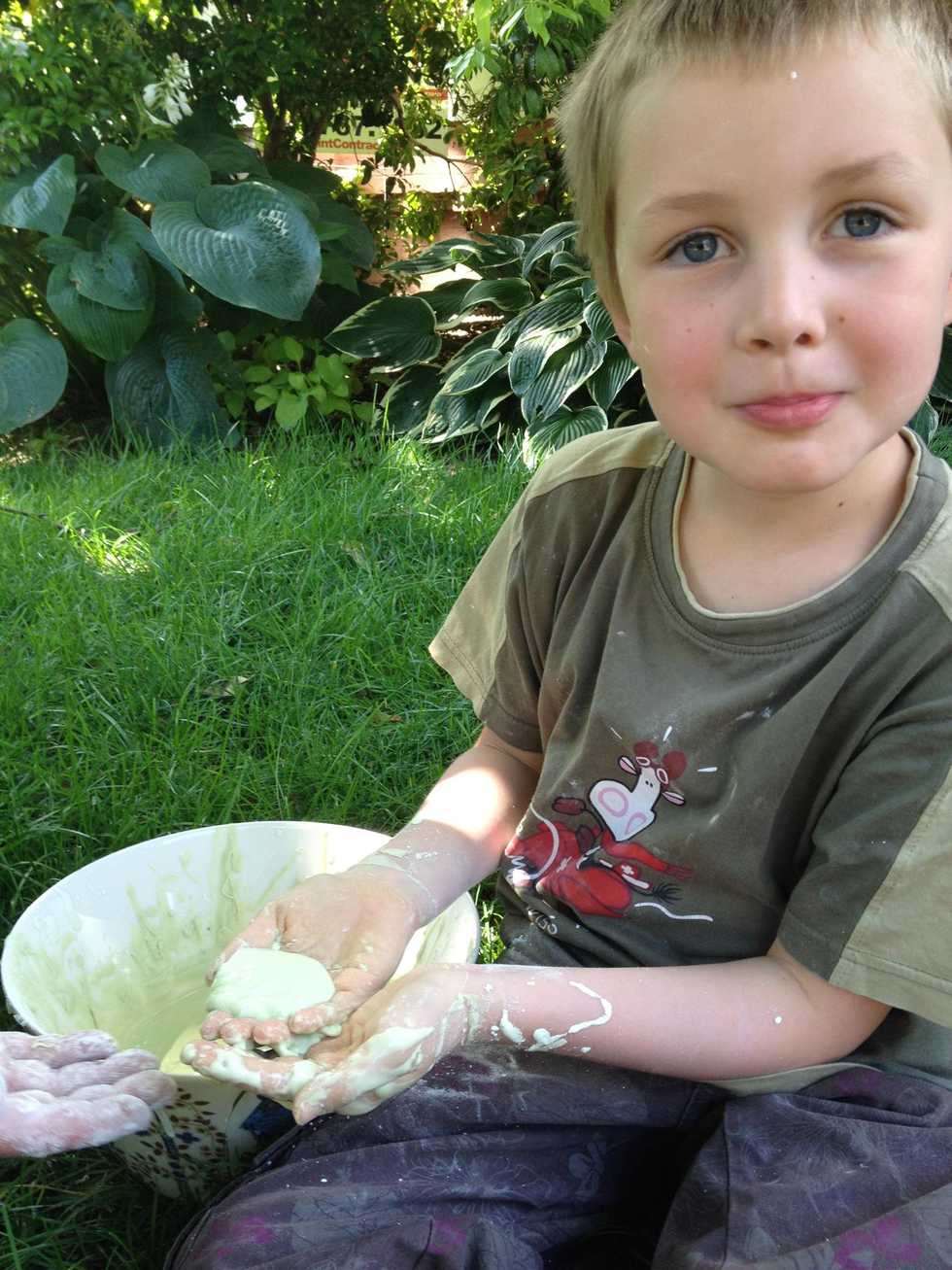 Get a cup of cornstarchAdd some food coloring. A few drops should do.Gradually add water and stir thoroughlyIf you over pour water, balance with cornstarch againBreak it down !Have some gooey fun