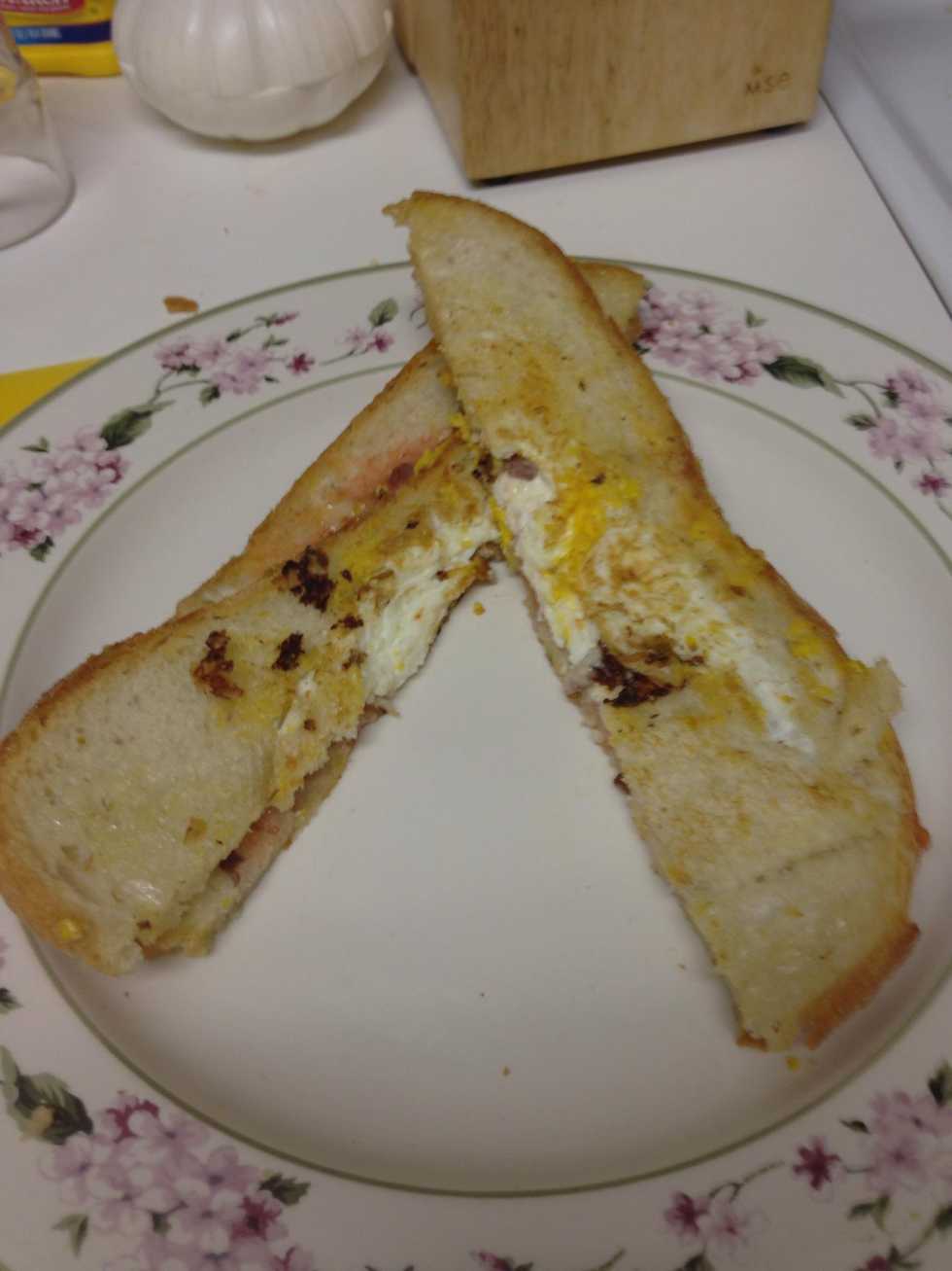 2 pieces of breadPress hard the glassCut tomato in halfSqueeze to breadSpread2 olivesSpread oliveCheddarOlive oil5 minutes to make the bottom hardPlace other brad another 3 minutesOpen eggCap itFlipp another 5 minutesThat's it