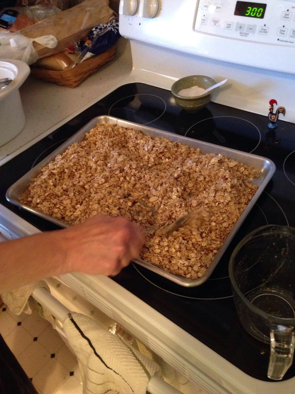 Pour the mixture into a bigger bowl with the oats, coconut and almonds.