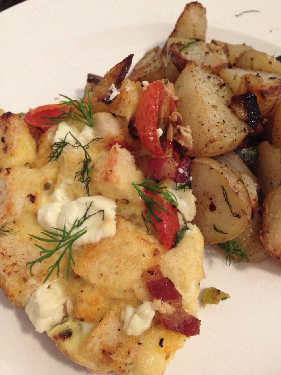 Add diced bread, whisked eggs, and goat cheese to pan and cook over low flame until egg sets. Sprinkle with fresh herbs; I used dill.