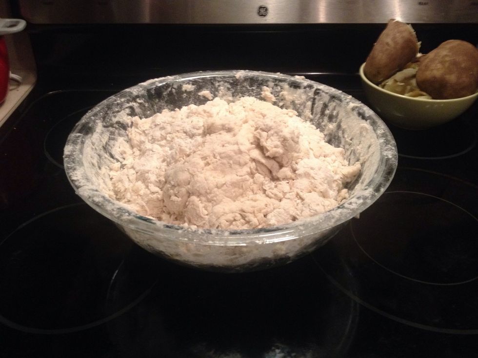 Sift 12 cups of flour and salt together I large bowl...I probably should've used a bigger one. Pour the potato water over and mix with your hands.