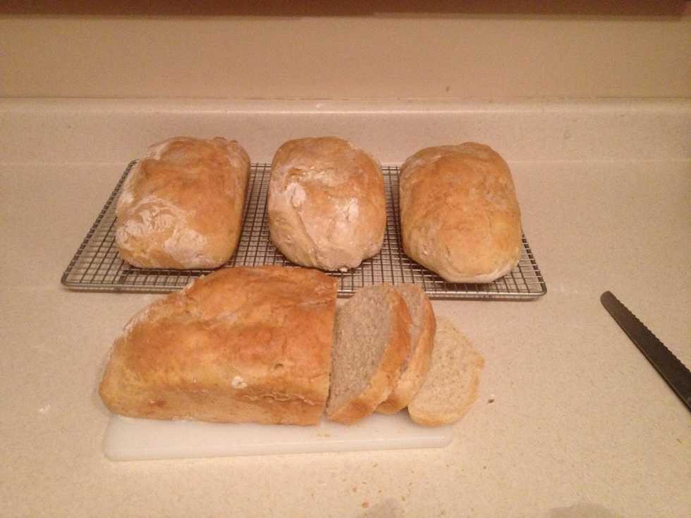 Sprinkle some flour on the counter and dump the dough onto the floured surface. Knead and separate into four parts. Sprinkle flour in the bottom of 4 bread pans. Shape and place the dough in each pan