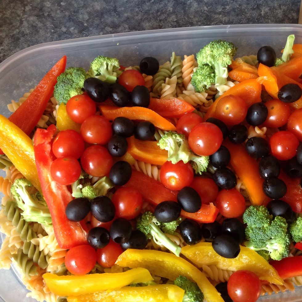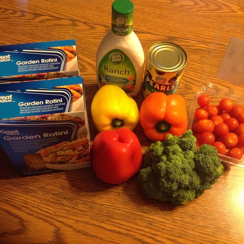 Boil multi color rotini for 7 minutes and drain, rinsing with cold water.