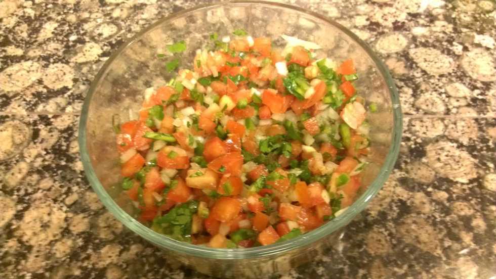 You will use 5 tomatoes, 4 jalapenos, handful of cilantro, half an onion, 1 lime, ground cumin, pepper, salt, and garlic powder.