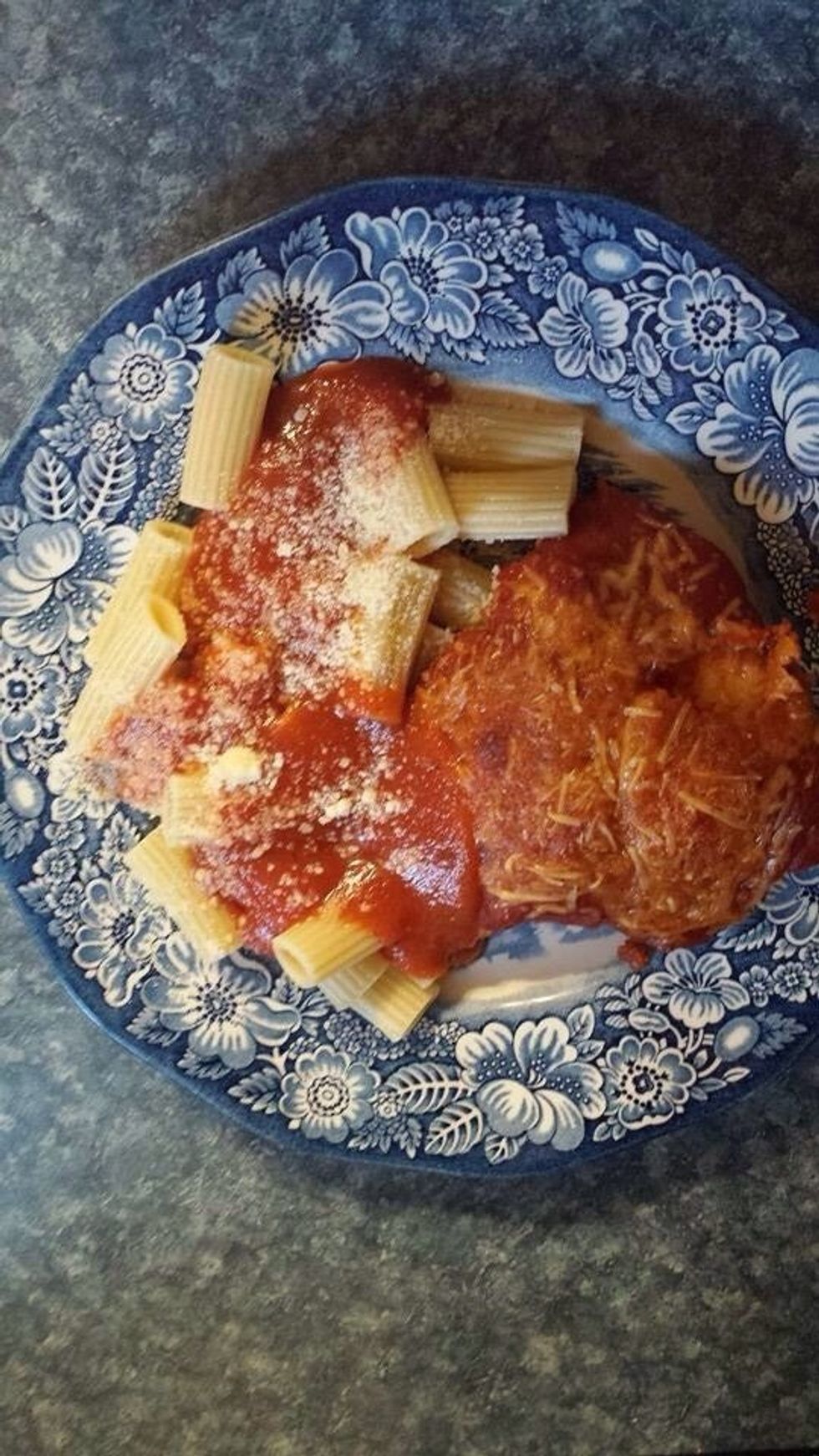 Serve chicken with pasta, sauce and extra Parmesan cheese. Bon appetit :-)
