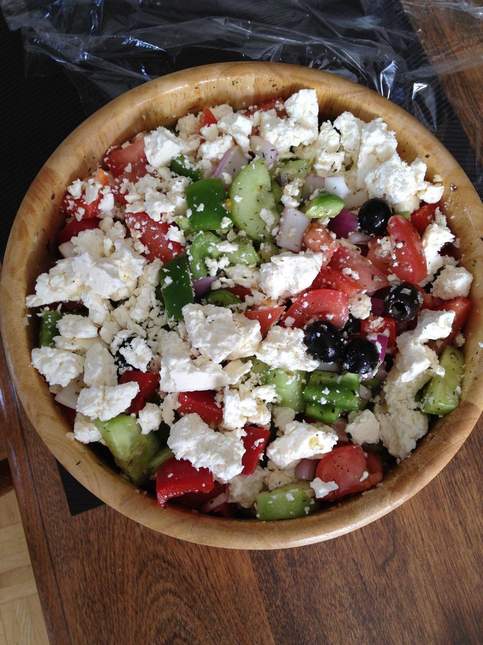 Make dressing (mix olive oil, red wine vinegar, mint, oregano and dill)
