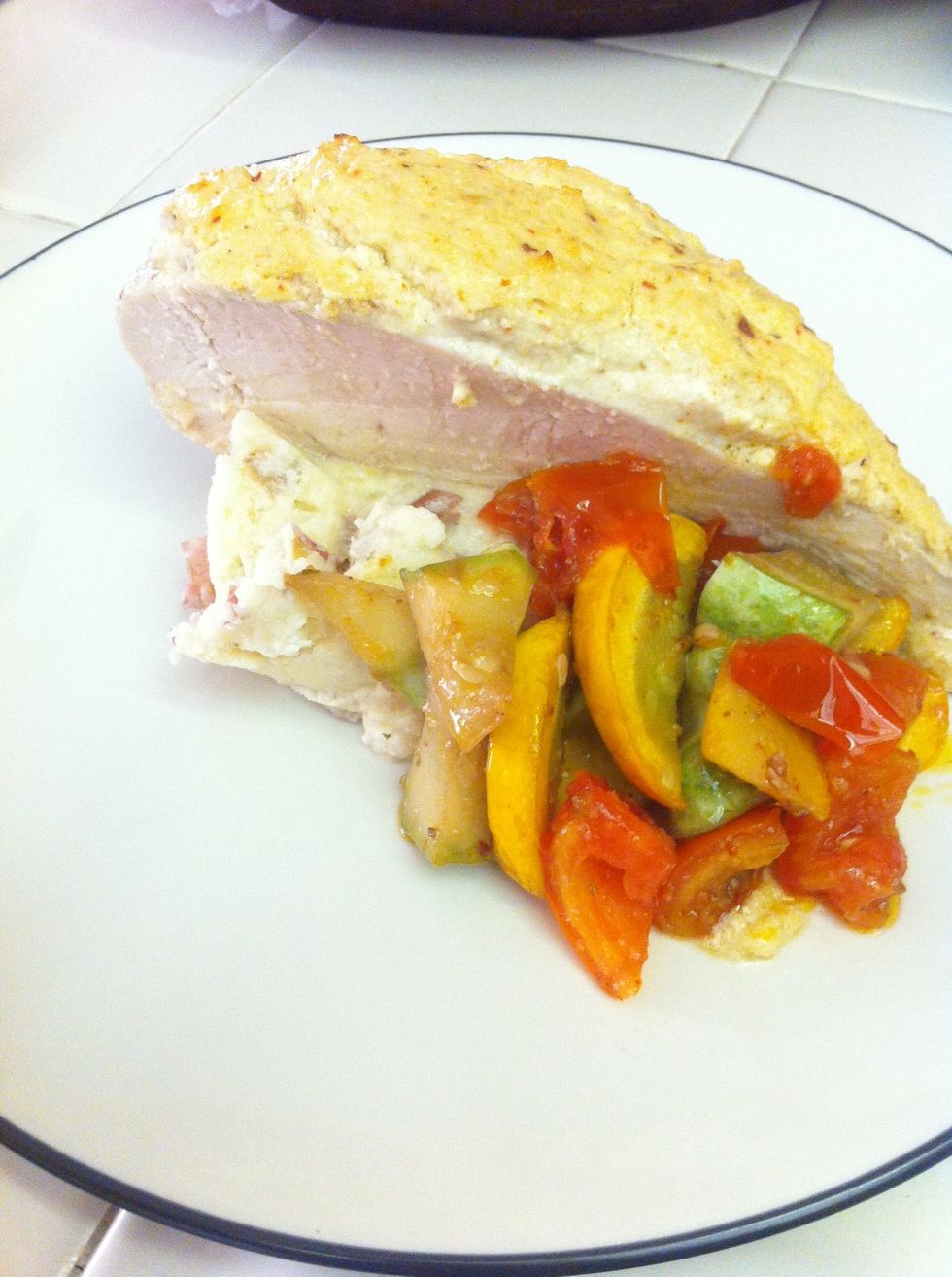 I use one giant breast so I sliced it in half. Serve with mashed potatoes and veggies... Enjoy!