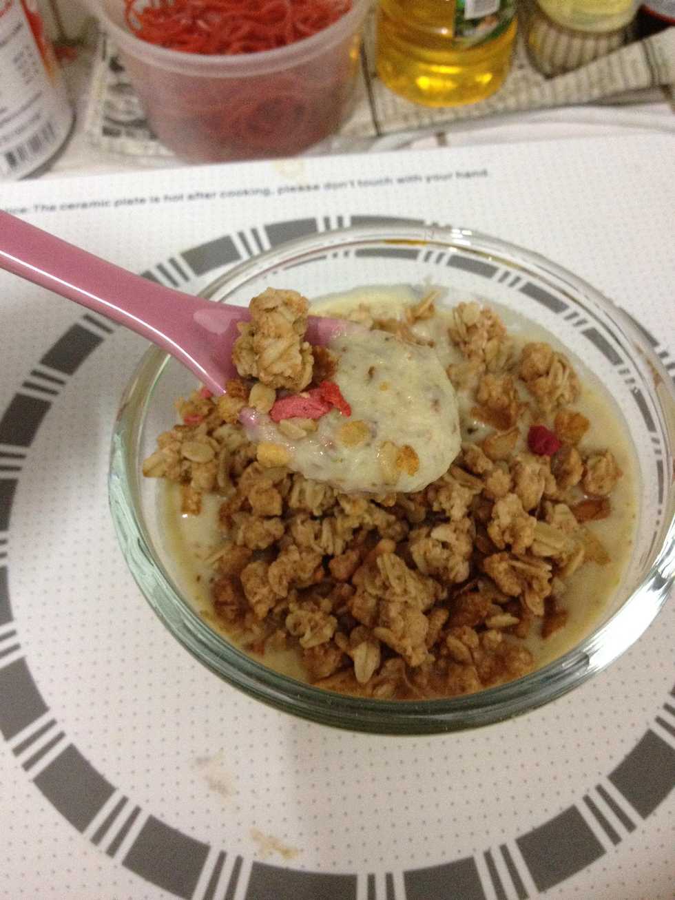 put yogurt in the cup with musli topping