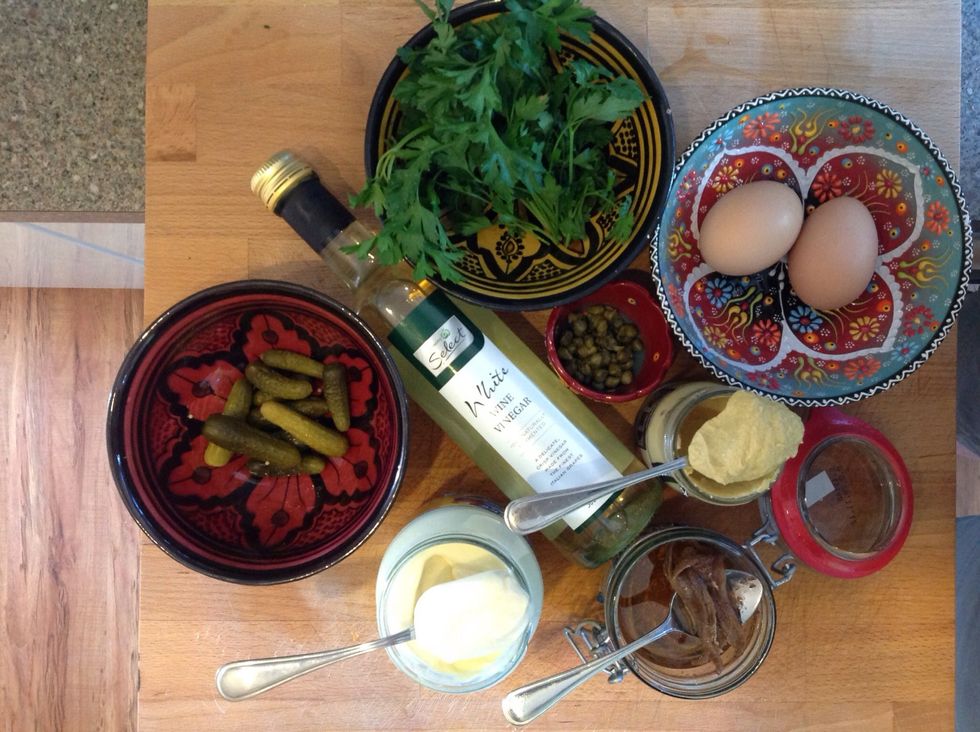 Mince anchovies, capers, a dollop of mayo and mustard, oh and chop parsley