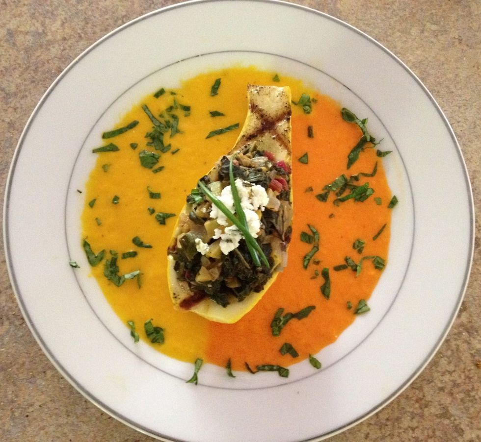 Fill the grilled squash with the Swiss chard mixture and top with goat cheese. Place gently in the middle of the plate.