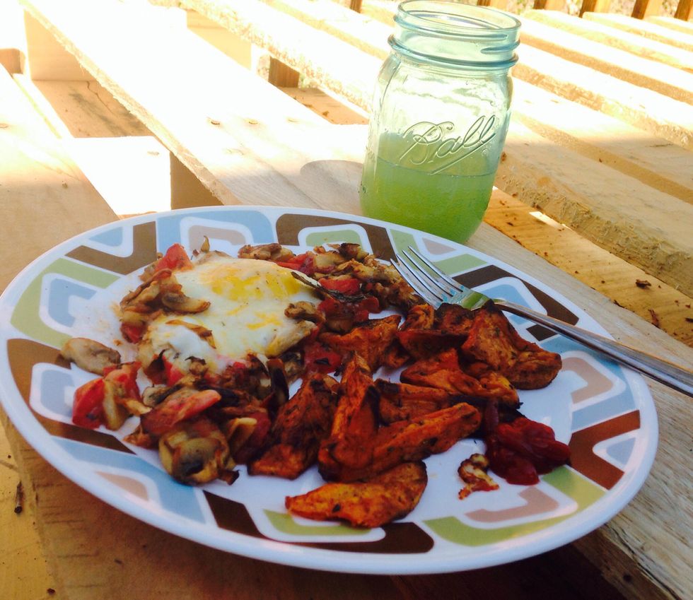 Onion3.0 Mushrooms Tomatoe1.0 Egg Shredded cheese Left over Fries (I used sweet potato fries) Spices (basil, salt and pepper Some ketchup on the side