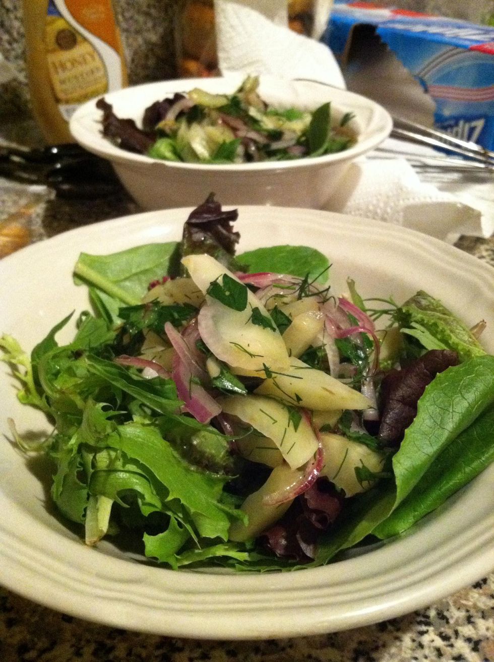 Slice the grilled fennel into strips and add, along with the honey, to the lemon juice and oil. Toss thoroughly.